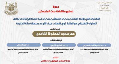 مكة – حصل الطالب عمر سعيد المحفوظ الغامدي على الماجستير في التربية الخاصة بتقدير ممتاز مرتفع A+ من جامعة ام القرى والتوصية بطباعة الرسالة