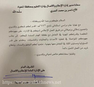 مشيداً بحرص وتفاعل كافة فريق العمل الإعلامي بتعليم المخواة على مستوى الإدارة والمكاتب والمدارس (بنين وبنات) وماقدموه من جهود تعكس قيم العمل الجماعي مؤكداً دور الأسر الفعال في إنجاح كافة الفعاليات والمناسبات الإعلامية حيث كان لتلك الجهود أكبر الأثر في صناعة محتوى إعلامي مؤثر وحراك إعلامي فاعل خلال عام استثنائي توج بالنجاح.