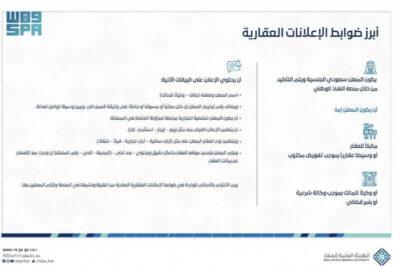 وتشمل الضوابط المصدرة اليوم، أن يكون المعلن سعودي الجنسية، وأن يسجل المعلنون عن طريق منصة النفاذ الوطني، أو أن يكون المعلن مالكًا للعقار، أو وكيلاً للمالك بموجب وكالة شرعية، أو وسيطاً عقارياً بموجب تفويض مكتوب أو بأمر قضائي، إضافة إلى ضرورة أن يتضمّن الإعلان اسم المعلن وصفته أو شخصية اعتبارية مرخصة لمزاولة النشاط في المملكة.
