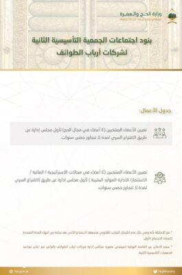 وجّهت وزارة الحج والعمرة، مساء الأحد، مؤسسات أرباب الطوائف إلى عقد الجمعية التأسيسية الأولى لشركات أرباب الطوائف (عن بعد) خلال الأسبوع الجاري.