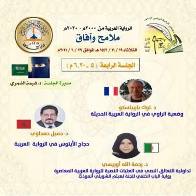 وقدمت الدكتوره رحمة الله أوريسي ورقة عمل عن تداولية التعالق النصي في العتبات النصية للرواية العربية المعاصرة بينت فيها عن مقاربة التعالقات النصية تداوليا من خلال التركيز على بعض النظريات الخاصة بالدرس التداولي مثل : نظرية أفعال الكلام، ونظرية الاستلزام الحواري،وغيرها ومعرفة مقاصد الروائيين من خلال توظيفهم لهذه النصوص القادمة من سياقات شتى