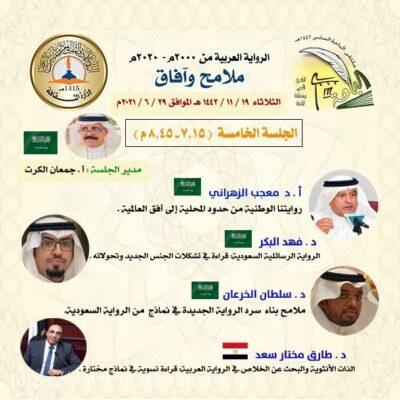 تلاها الجلسة الخامسة التي ادارها القاص جمعان الكرت حيث قدم الدكتور معجب الزهراني ورقة عمل بعنوان روايتنا الوطنية من حدود المحلية إلى أفق العالمية واشار الدكتور الزهراني الى أن ‏‎ليس من السهل تتبع مسيرة الرواية المحلية على مدى عشرين عاما توالت خلالها المغامرات وتنوعت المنجزات الكتابية لتشكل طفرة واضحة في هذا المجال فنحن نفتقد إلى تلك المجلات الأدبية – النقدية العامة أو المتخصصة التي عادة ماترصد وتصاحب وتحاور المنتجات الإبداعية بانتظام لتشكل مرجعا معتمدا للقراء والباحثين كما هي حال في عديد الفضاءات الأخرى وتتعذر المتابعة اليومية لما ينشره بعض الأفراد في الصحف أو في مواقع التواصل الاجتماعي من أخبار الرواية وكتابها فيظل في حكم الموجود المفقود لأنه غير معتمد وغير وظيفي بكل بساطة وتزداد الصعوبات أكثر حين تتصل بالذات الناقدة التي تكتب الآن أداء لواجب المشاركة في ملتقى يروم النهوض بتلك المهمة المعرفية ولو في مستواها العام