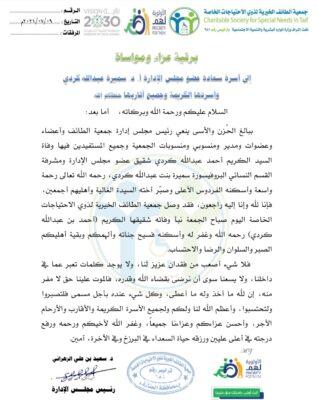 الطائف : ببالغ الحزن والأسى ينعي رئيس مجلس إدارة جمعية الطائف لذوي الاعاقة الدكتور سعيد الزهراني وأعضاء وعضوات ومدير ومنسوبي ومنسوبات الجمعية وجميع المستفيدين فيها وفاة السيد الكريم احمد عبدالله كردي شقيق عضوة مجلس الادارة ومشرفة القسم النسائي البرفيسورة سميرة بنت عبدالله كردي .