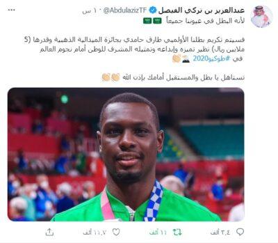 وكتب وزير الرياضة في حسابه: “لأنه البطل في عيوننا جميعاً فسيتم تكريم بطلنا الأولمبي طارق حامدي بجائزة الميدالية الذهبية وقدرها (5 ملايين ريال) نظير تميزه وإبداعه وتمثيله المشرف للوطن أمام نجوم العالم في طوكيو 2020″، وأضاف: تستاهل يا بطل والمستقبل أمامك بإذن الله.