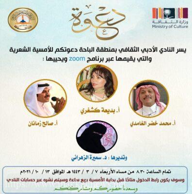 الباحة – يستضيف النادي الأدبي الثقافي بمنطقة الباحة الأربعاء القادم ٧-٣-١٤٤٣هـ عدد من نجوم الشعر في أمسية شعرية حيث سيشارك الشاعر محمد خضر الغامدي والشاعرة بديعة كشغري والشاعر صالح زمانان وتُدير الأمسية الدكتورة سميرة الزهراني هذا وسيتم بث الأمسية في تمام الساعة الثامنة والنصف مساء الأربعاء ، عبر برنامج zoom وسيفتح الرابط قبل الأمسية بربع ساعة . وأشار رئيس النادي الأدبي الثقافي بالمنطقة حسن بن محمد الزهراني بأن هذه الأمسية الشعرية التي تضم نخبة من شعراء الوطن تأتي امتداداً لبقية الأمسيات التي يقيمها النادي في سياق الأنشطة المتنوعة إرضاءً لجميع الأذواق والأطياف الأدبية والثقافية وسيتم حفظها في موقع النادي على اليوتيوب بعد انتهاء الأمسية.