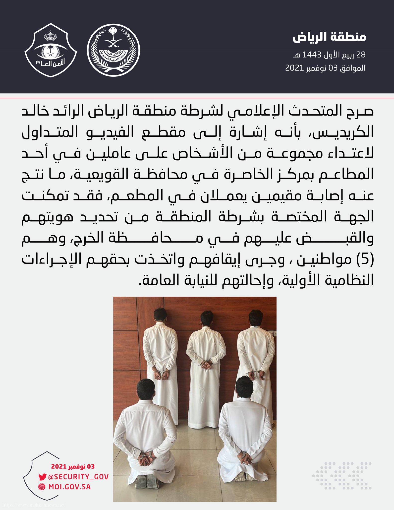 القبض على خمسة أشخاص اعتدوا على عاملين في أحد المطاعم بمركز الخاصرة في محافظة #القويعية