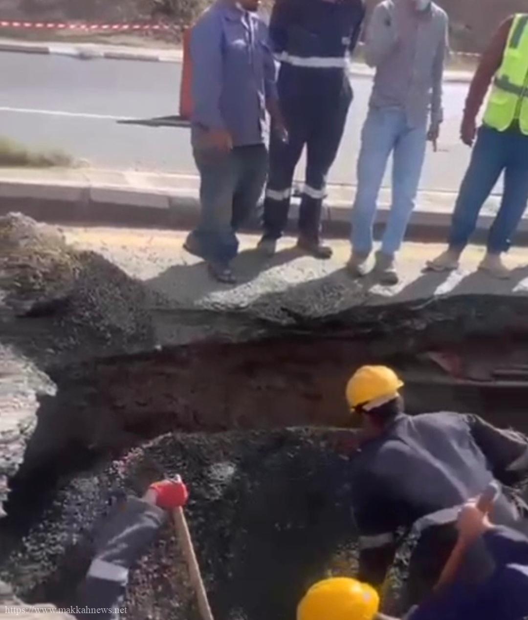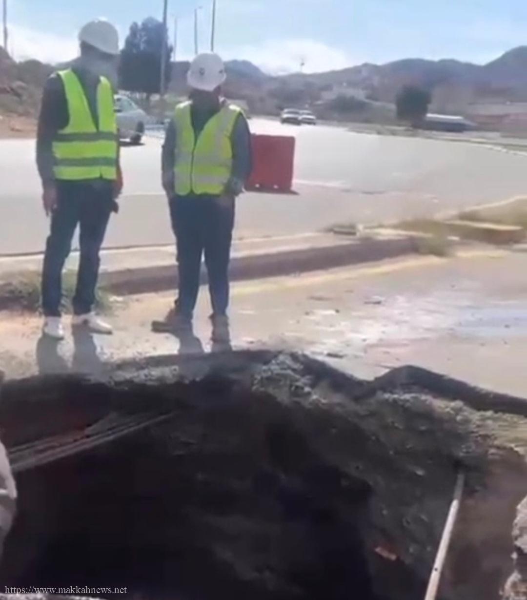 وتعمل شركة المياه الوطنية على إصلاح خط الصرف وسيتم فتح الطريق بعد إعادة إصلاح الهبوط والسفلتة.