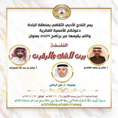الباحة – ينظم النادي الأدبي الثقافي بمنطقة الباحة الأثنين القادم ٢٨-٦-١٤٤٣هـ أمسية فكرية بعنوان : الفلسفة بين الشك واليقين حيث سيشارك فيها الاستاذ صالح سعيد الغامدي والاستاذ تركي عبدالله الزهراني ويُديرها مدير فرع هيئة الصحفيين بالمنطقة الدكتور علي الرباعي وسيتم بث الأمسية في تمام الساعة الثامنة والنصف مساء الأثنين ، عبر برنامج zoom وسيفتح الرابط قبل الأمسية بربع ساعة