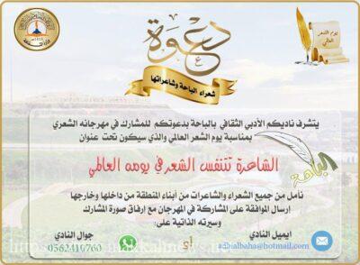 الباحة – تحت رعاية صاحب السمو الملكي الأمير الدكتور حسام بن سعود بن عبدالعزيز أمير منطقة الباحة يحتفل نادي الباحة الأدبي الثقافي بيوم الشعر العالمي الأربعاء ٢٠ / ٨ / ١٤٤٣ وسوف يكون المهرجان هذا العام خاصاً بشعراء وشاعرات الباحة من داخل المنطقة وخارجها.
