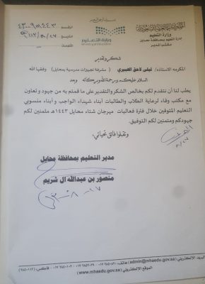 محايل – كرم مدير إدارة التعليم بمحافظة محايل عسير الأستاذ منصور عبدالله آل شريم مشرفة مصادر التعلم الأستاذة ليلى أحمد لاحق الهبيري لقاء جهودها وتعاونها مع مكتب وفاء لرعاية الطلاب والطالبات من ابناء شهدا الواجب وأبناء منسوبي التعليم المتوقين خلال فترة مهرجان شتاء محايل لعام 1443 .