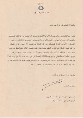 وأعلن الأمير حمزة عن هذا القرار في رسالة نشرها اليوم الأحد على حسابه في موقع “تويتر”، قائلا إنه، “بعد ما لمسه وشاهده في الأعوام الأخيرة” خلص إلى استنتاج بأن “قناعته الشخصية والثوابت التي غرسها والده فيه” لا تتماشى مع “النهج والتوجهات والأساليب الحديثة لمؤسساتنا”.