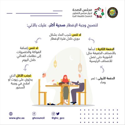 الرياض – نوه مجلس الصحة الخليجي عبر حساباته الرسمية على وسائل التواصل الاجتماعي على ضرورة أن يكون ألافطار خلال شهر رمضان صحياً، وذلك بإتباع للعديد من السلوكيات الصحية الهامة منها : أن تكون بداية الإفطار على التمر والماء، وفي المرحلة الثانية من الإفطار الحرص على أن نتدرج بالأصناف الخفيفة مثل الشوربة إلى ألوصول إلى الاطباق الرئيسية.