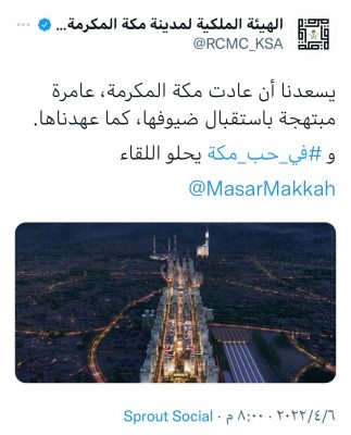 أطلقت شركة أم القرى للتنمية والإعمار المالك والمطور لـ «وجهة مسار» في مكة المكرمة، وسم #في_حب_مكة، وذلك ضمن حملتها الترويجية خلال شهر رمضان المبارك؛ احتفاًء بعودة مكة المكرمة إلى استقبال ضيوف الرحمن من المعتمرين والزوار والمصلين من داخل وخارج المملكة العربية السعودية بكامل طاقتها الاستيعابية، بعد رفع الجهات المختصة كافة القيود المتعلقة بجائحة فيروس كورونا (COVID-19).