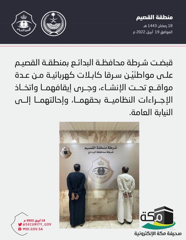 شرطة محافظة البدائع بمنطقة القصيم تقبض على شخصين سرقا كابلات كهربائية من مواقع تحت الإنشاء
