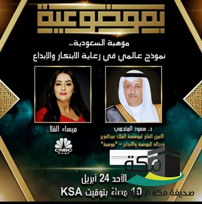 حول موضوع “موهبة” السعودية.. نموذج عالمي في رعاية الابتكار والإبداع. تستضيف قناة CNBC العربية يوم الاحد 2022/4/24 وضمن حلقة جديدة من برنامج الشهير “بموضوعية” معالي الامين العام لمؤسسة الملك عبدالعزيز ورجاله لرعاية الموهبة والابداع “موهبة” الدكتور سعود بن سعيد المتحمي.هذه الحلقة التي تقدمها الاعلامية، ميساء القلا ستبث الساعة 10م بتوقيت السعودية.