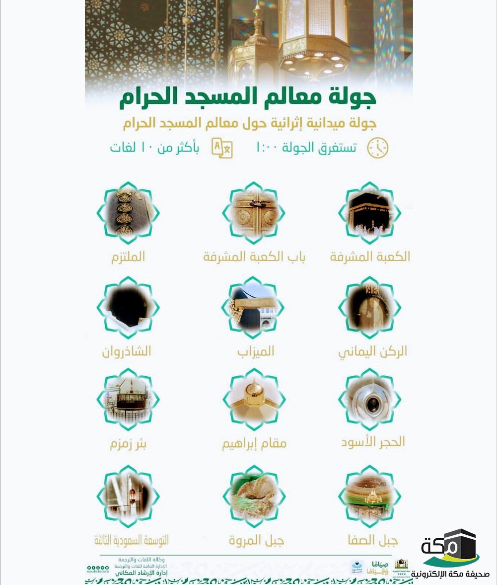 خصصت الرئاسة العامة لشؤون المسجد الحرام والمسجد النبوي، خدمة (جولة معالم المسجد الحرام)، وذلك من خلال وكالة اللغات والترجمة، ممثلة في إدارة الإرشاد المكاني التابعة للإدارة العامة للغات والترجمة، بهدف إثراء ثقافة القاصدين، وترسيخ أجمل الصور في أذهانهم وذلك بمختلف جنسياتهم ولغاتهم، أوضح ذلك وكيل إدارة الإرشاد المكاني ،منذر بن أحمد واجد.