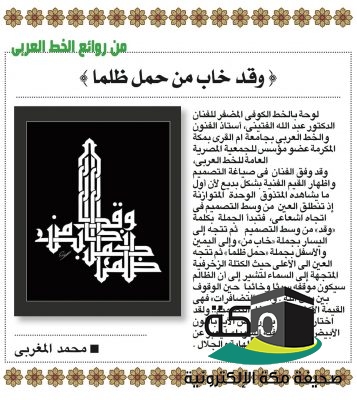 وخص الدكتور عبدالله فتيني ، صحيفة مكة الالكترونية بهذه اللوحات الفنية الابداعية من اعماله ، والتي اصاغها بخط الثلث والكوفي ، وبالخط الكوفي المورق.