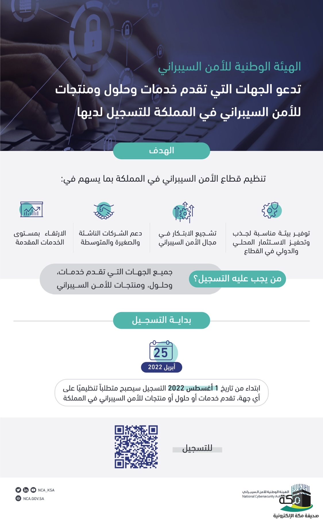 دعت الهيئة الوطنية للأمن السيبراني الجهات التي تقدم خدمات أو حلول أو منتجات الأمن السيبراني في المملكة إلى تسجيل بياناتها عبر موقعها الإلكتروني ابتداء من اليوم الاثنين ٢٥ أبريل ٢٠٢٢م، وتأتي هذه الخطوة في إطار جهود الهيئة الرامية إلى تنظيم قطاع الأمن السيبراني في المملكة على النحو الذي يسهم في حماية المصالح الحيوية للدولة وأمنها الوطني والارتقاء بمستوى الخدمة المقدمة في القطاع، وتوفير بيئة مناسبة لجذب وتحفيز الاستثمار المحلي والدولي فيه.