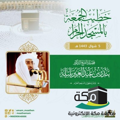 خطيب الجمعة الاول 5 شوال 1443هـ بالمسجد الحرام معالي الشيخ الدكتور بندر بن عبدالعزيز بليلة.