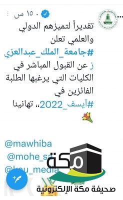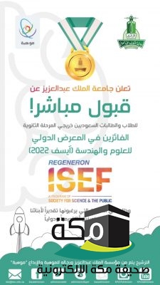 تقديراً لتميزهم الدولي والعلمي ، اعلنت جامعة الملك عبدالعزيز، ممثلة في عمادة القبول والتسجيل في الجامعة، عن القبول المباشر في الكليات التي يرغبها طلبة المنتخب السعودي للعلوم والهندسة، والفائزين مؤخرا في مسابقة ومعرض (ريجنيرون) في مجالات ومسارات لعلوم والهندسة، الذي اختتم مؤخرا في اتلانتا بولاية جورجيا، بالولايات المتحدة الامريكية ” آيسف 2022م”، تحت مظلة واشراف من مؤسسة الملك عبدالعزيز ورجاله لرعاية الموهبة والابداع”موهبة” والذين بلغ عددهم 35 طالب وطالبة من مرحلة التعليم الثانوية، بعدد11 ادارة تعليمية بوزارة التعليم، في مناطق ومحافظات المملكة العربية السعودية، والذين حققوا 22 جائزة كبرى وخاصة في المسابقة وعلى مستوى العالم مؤخرا ،وقدمت الجامعة التهنئة للطلبة واولياء امورهم والمشرفين عليهم، على هذا الانجاز الوطني الذي تحقق،عبر تغريدة تم بثها اليوم على موقع المدونات القصير الاجتامعي على الشبكة العنكبوتية الالكترونية “تويتر”