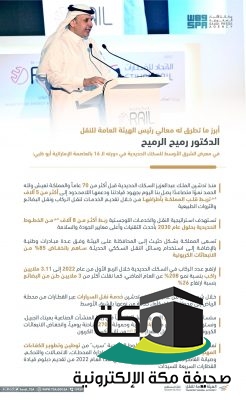 استعرض معالي رئيس الهيئة العامة للنقل الدكتور رميح بن محمد الرميح أبرز المشاريع النوعية في الخطوط الحديدية في المملكة، وذلك خلال مشاركته في معرض ومؤتمر الشرق الأوسط للسكك الحديدية في دورته السادسة عشرة ، الذي يقام على مدى يومين في مركز المعارض بأبو ظبي في دولة الإمارات العربية المتحدة تحت رعاية الشيخ منصور بن زايدآل نهيان نائب رئيس مجلس الوزراء وزير شؤون الرئاسة، وبالتعاون مع وزارة الطاقة والبنية التحتية ودائرة الثقافةوالسياحة في أبوظبي، وبمشاركة عدد من صناع القرار في قطاع النقل العربي و250 عارضاً من مختلف دول العالم،بالإضافة إلى 600 من كبار الشخصيات والرؤساء التنفيذيين لجميع مشغلي السكك الحديدية الرئيسيين من جميعأنحاء المنطقة.