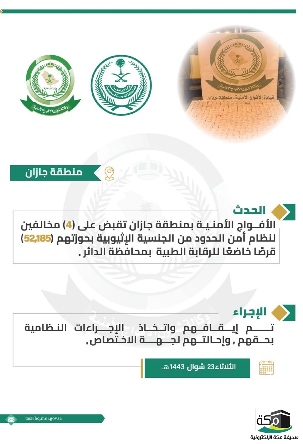 #الأفواج_الأمنية‬⁩ بمنطقة جازان تقبض على (4) مخالفين لنظام أمن الحدود بحوزتهم مواد مخدرة