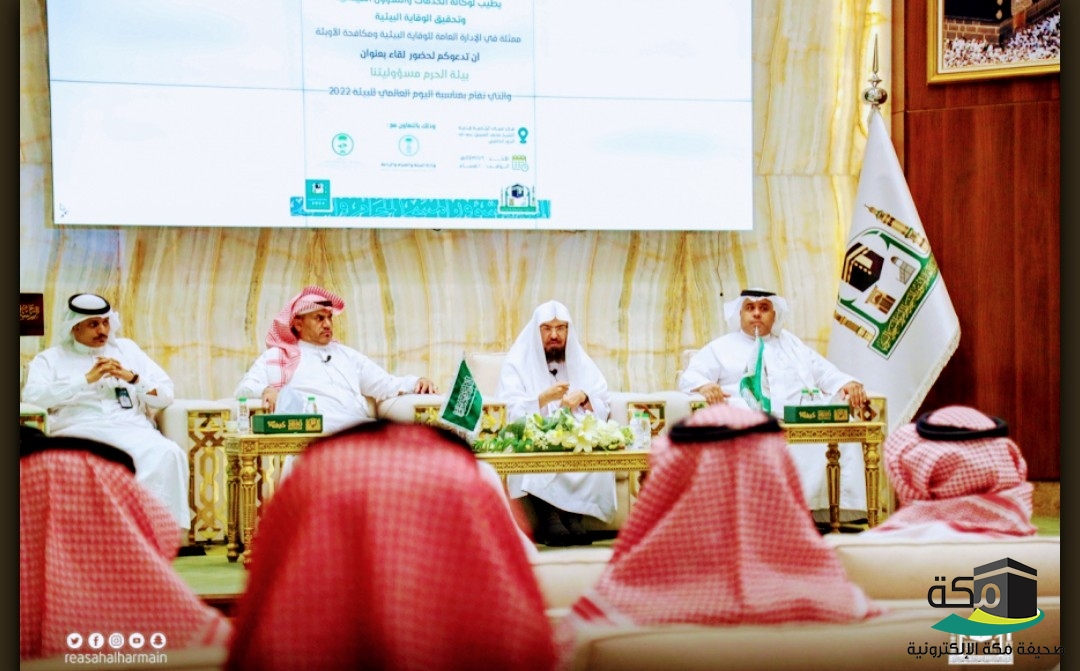 برعاية الرئيس العام لشؤون المسجد الحرام والمسجد النبوي الدكتور عبدالرحمن بن عبدالعزيز السديس، أقامت وكالة الخدمات والشؤون الميدانية وتحقيق الوقاية البيئية لقاء بعنوان “بيئة الحرم مسؤوليتنا”، وذلك في قاعة الشيخ محمد السبيل -رحمه الله- بالمبنى الإداري للرئاسة العامة لشؤون المسجد الحرام والمسجد النبوي، وجاء ذلك تزامناً مع اليوم العالمي للبيئة (2022م) وبالتعاون مع وزارة البيئة والمياه والزراعة والمركز الوطني للتصحر.
