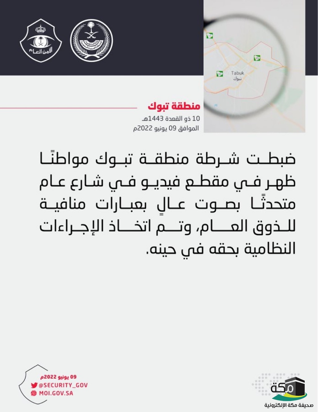 شرطة منطقة #تبوك تضبط شخصًا لتحدثه بعبارات منافية للذوق العام في مكان عام.