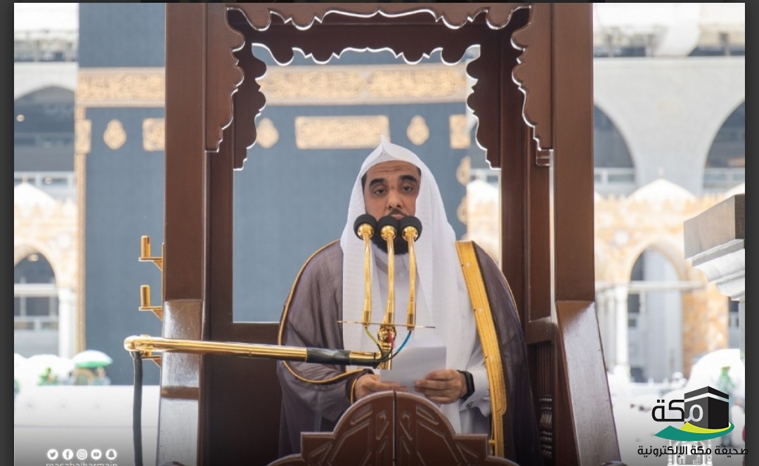ثم تحدث عن أيام الحج فقال: في هذه الأيام المباركة يفد المسلمون من مشارق الأرض ومغاربها إلى بيت الله الحرام لأداء فريضة الحج امتثالًا لأمر الله واتباعًا لسنة نبينا محمد عليه الصلاة والسلام فإن الحج فريضة من فرائض الدين ، يجتمع فيه المسلمون لأداء هذه العبادة كما أداها رسول اللہ ﷺ ، ويحصل بهذا التجمع منافع كثيرة وتعاون على البر والتقوى ، والمسلمون الوافدون إلى بيت الله حين يحسون بقربهم من الله عند بيته المحرم تصفوا أرواحهم ، وترق قلوبهم وتخشع لذكر الله عند هذا المحور الذي يشدهم جميعاً ، إنها القبلة التي يتوجهون إليها ويلتفون حولها ، يجدون رايتهم التي يستظلون بها ويسيرون تحتها ويرجعون إليها ، إنها راية الإيمان : « لا إله إلا الله محمد رسول الله » .