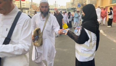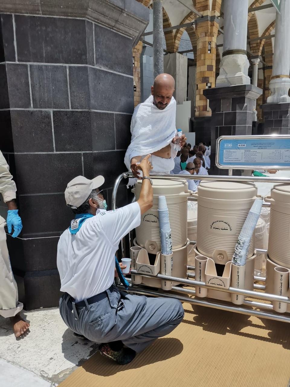 فيما يمثل توزيع المياه على ضيوف بيت الله الحرام ، المسار الثالث ، حيث تعمل كشافة وزارة التعليم على توزيع 8000 عبوة ماء يومياً, من أمام مركز (بادر) الكشفي لخدمة ضيوف الرحمن