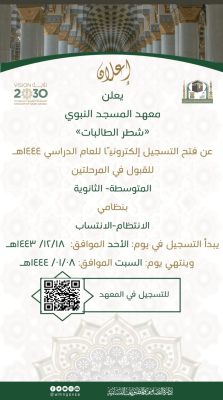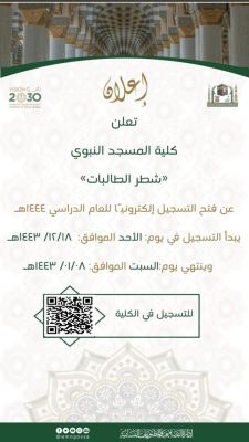 اعلنت الرئاسة العامة لشؤون المسجد الحرام والمسجد النبوي ، ممثلة بوكالة شؤون المسجد النبوي ، عن ‏فتح التسجيل الإلكتروني للطالبات في كلية ومعهد المسجد النبوي للعام الدراسي 1444هـ شطر الطالبات ،وذلك اعتبارا من اليوم الاحد 1443/12/18 ولغاية السبت 1444/01/08.