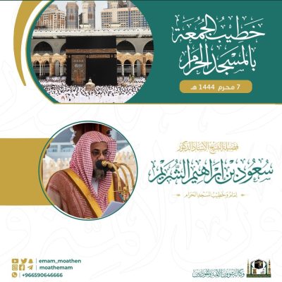 اعلنت الرئاسة العامة لشؤون المسجد الحرام والمسجد النبوي ، ممثلة بوكالة شؤون الأئمة والمؤذنين ، وعبر إدارة شؤون الأئمة ، ان خطيب الجمعة 7 محرم 1444هـ بالمسجد الحرام الشيخ الدكتور سعود ابراهيم الشريم ،إمام وخطيب صلاة الجمعة بالمسجد النبوي الدكتور أحمد بن طالب بن حميد.