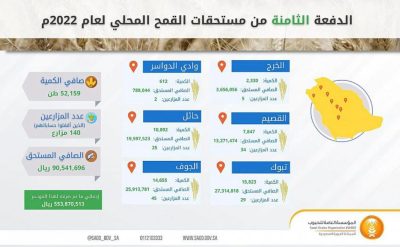 واس – أعلنت المؤسسة العامة للحبوب عن صرف مستحقات الدفعة الثامنة من مزارعي القمح المحلي، شاملة الدفعة الرابعة من مستحقي العلاقة التعاقدية بين المزارعين والشركات الزراعية، اللذين قاموا بتوريد الكميات المخصصة لهم لهذا الموسم 1444/1443هـ، وإغلاق الحسابات عبر المنصة الإلكترونية “محصولي” على الموقع الرسمي للمؤسسة.