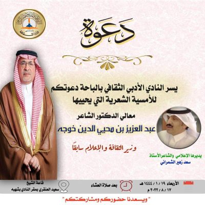 الباحة – تحت رعاية صاحب السمو الملكي الأمير الدكتور حسام بن سعود بن عبدالعزيز أمير منطقة الباحة ينظم النادي الأدبي الثقافي بالمنطقة الإربعاء القادم بقاعة الشيخ سعيد العنقري بمقر النادي أمسية شعرية لمعالي الدكتور عبدالعزيز بن محيي خوجه وزير الثقافة والإعلام سابقًا الفائز مؤخرا “بجائزة البابطين” للإبداع الشعري وذلك في سياق البرامج والفعاليات التي يقيمها أدبي الباحة ضمن فعاليات صيف هذا العام