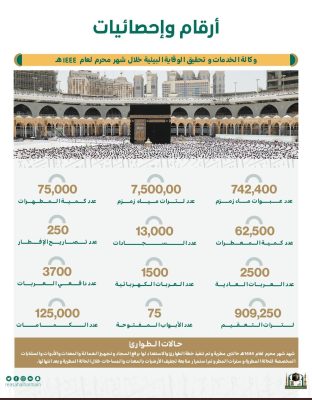 اعلنت الرئاسة العامة لشؤون المسجد الحرام والمسجد النبوي، ممثلة في وكالة الخدمات وتحقيق الوقاية البيئية ، عن احصائيات الخدمات المنفذة خلال شهر محرم لعام 1444هـ بالمسجد الحرام ، والتي شهدت حالتي طوارئ مطرية تطلبت التدخل في توزيع سترات المطر، واستخدام المعدات لازالة آثار تسافط الامطار. وكشفت الاحصائية التي تضمنت ارقام ومعلومات 12 خدمة عن انه تم توزيع ما عدده 742400 عبوة ماء زمزم خلال تلك الفترة، اضافة الى استخدام 13 الف سجادة للصلاة .
