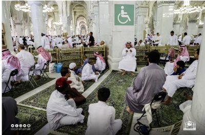 من جانبه اشار مدير عام الإدارة العامة لشؤون الأشخاص ذوي الإعاقة برئاسة شؤون الحرمين، ماهر بن سعيد السويهري أن الإدارة خصصت مصلى خاص بترجمة خطبة الجمعة بلغة الإشارة لذوي الاعاقة السمعية, مبينًا أن الإدارة العامة لشؤون الأشخاص ذوي الإعاقة حرصت على توفير كافة المواد والمستلزمات اللازمة والخدمات والبرامج المطورة التي توفير بيئة مناسبة في المواقع المخصصة وتجهيز كافة الخدمات والتسهيلات لاستقبال الأشخاص ذوي الإعاقة، كذلك يتم توزيع حوامل المصحف والمصاحف بلغة برايل وتلبية احتياجاتهم، والسعي لتوفير الخدمات للصم في تسهيل عملية التواصل وترجمة لغة الإشارة للخطب والدروس العلمية، وتعتمد لغة الإشارة اعتمادًا كبيرًا على التواصل البصري.