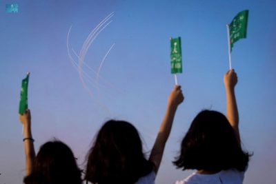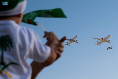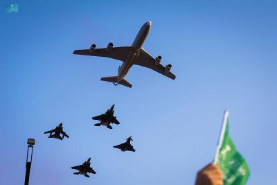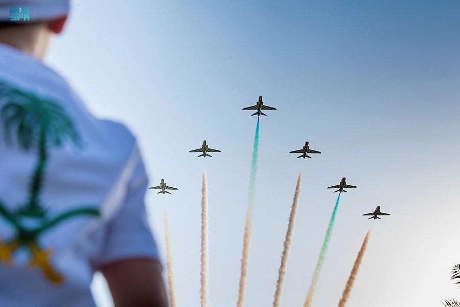 وتقدم المقاتلات السعودية والطائرات العسكرية والمدنية أكبر استعراض جوي في تاريخ المملكة تحت شعار “تحية وطن”، والتي ستنطلق في مختلف مناطق المملكة لتغطي 13 مدينة رئيسة.