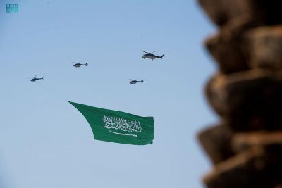 وتشارك وزارة الحرس الوطني بعدد من المروحيات في بداية العروض الجوية بالتزامن مع مروحيات طيران الأمن التي ستحمل إحداها علم المملكة في جولة تمتد نحو نصف ساعة.