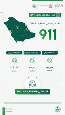 تلقى المركز الوطني للعمليات الأمنية عبر رقم الطوارئ الموحد (911) في مناطق الرياض، مكة المكرمة، المنطقة الشرقية (1,865,826) اتصالاً خلال شهر صفر من عام 1444 هـ، وذلك ضمن مهام مراكز العمليات الأمنية الموحدة (911) في استقبال المكالمات وتحويلها للجهات الأمنية والخدمية حسب الاختصاص باستخدام أنظمة آلية ومتطور يعمل عليها كادر متخصص بعدة لغات وبدقة واحترافية عالية على مدار الساعة.