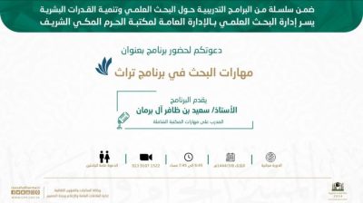 نفذت الرئاسة العامة لشؤون المسجد الحرام والمسجد النبوي ،عبر وكالة المكتبات والشؤون الثقافية النسائية، ممثلة بالإدارة العامة لمكتبة الحرم المكي الشريف النسائية وإدارة البحث العلمي النسائية اليوم، مبادرة الأبحاث الرائدة للباحثين والباحثات.