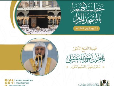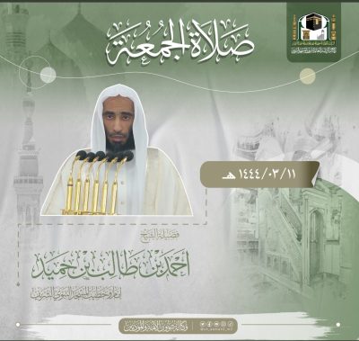 ‏اعلنت الرئاسة العامة لشؤون المسجد الحرام والمسجد النبوي ، وعبر وكالة شؤون الأئمة والمؤذنين،  ممثلة في إدارة شؤون الأئمة ، ان امام خطيب الجمعة 11 ربيع الأول 1444هـ بالمسجد الحرام، ‎الدكتور ماهر حمد المعيقلي – و‏إمام وخطيب صلاة الجمعة بالمسجد النبوي، الدكتور أحمد بن طالب بن حميد.