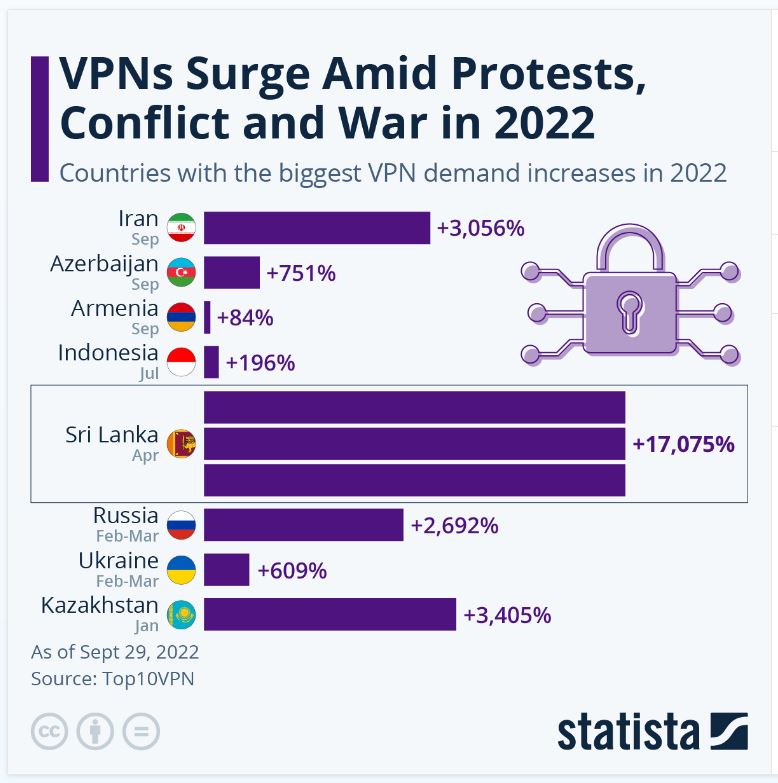 في إيران، زاد الطلب على تنزيلات VPN بأكثر من 3000 بالمائة في سبتمبر 2022، وفقًا لموقع Top10VPN.com. ومع ذلك، فقد شهدت دول أخرى أيضًا ارتفاعات كبيرة في الطلب عليه هذا العام. فعلى سبيل المثال، شهدت سريلانكا زيادة بنسبة 17000 في المائة في تنزيلات VPN في 3 أبريل 2022، عندما تم حظر منصات التواصل الاجتماعي Facebook وYouTube وTwitter وInstagram وWhatsApp. جاء انقطاع الإنترنت في الوقت الذي فرضت فيه الحكومة حظر التجول، في محاولة لمنع المتظاهرين من الاقتراب من الشوارع بسبب الانكماش الاقتصادي الكارثي، الذي يُعزى بشكل أساسي إلى سوء إدارة الحكومة، مما أدى إلى نقص كبير في الغذاء والوقود.