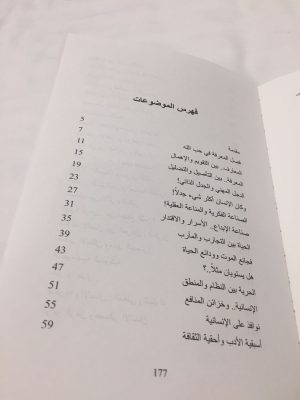 وجاء الكتاب منفرداً ومتخصصا في موضوعات فلسفية ومعرفية وثقافية وادبية في فصول متنوعة من خلال 175 صفحة من النوع المتوسط وشملت اكثر من 140 موضوعاً مختلفاً في الفلسفة والمعرفة والسلوك والثقافة والأدب والنقد .