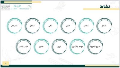 فيما استهدف البرنامج 75معلمة تربية أسرية و15 مشرفة تربية أسرية وذلك بهدف التمييز بين مفهومي الصحة والعافية والاستدلال عليهما من الأحاديث النبوية الشريفة ، توضيح أبعاد العافية السبعة بعبارات بسيطة ، ذكر أمثلة على جهود المملكة في تعزيز بعض جوانب العافية لدى الفرد والمجتمع ، تحديد مسؤولية الفرد ودوره في تحقيق أبعاد العافية السبعة في الأسرة والمجتمع ، استنتاج الجهود الدولية والمحلية المبذولة لتحسين العافية عبر مكافحة التغير المناخي الناتج عن الانبعاثات الغازية المضرة ، تفسير أثر مجموعة متنوعة من الممارسات والصفات الشخصية في تعزيز العافية ، وصف محددات الصحة المتنوعة بطريقة بسيطة ، استخلاص جهود المملكة العربية السعودية ممثلة في وزارة الصحة ودورها المهم في تعزيز الصحة ، وتوضيح دور القانون والنظام في تعزيز الصحة ، واستنتاج أثر العمل التعاوني مع الأقران والآخرين لأجل تحسين الصحة الشخصية والتمييز بين المسؤولية الفردية والمسؤولية الحكومية في تعزيز الصحة على مستوى المجتمع ، وابتكار مبادرة في تحسين الصحة الشخصية على مستوى الأسرة ” تدوير مخلفات البلاستيك أنموذجا” وتطبيق طرق تدريس تفاعلية ليقترح محسنات للصحة الشخصية والعامة ، اقتراح وسائل تعزيز الحالة الصحية للمصابين بالأمراض غير المعدية ، تعريف بعض المفاهيم والمصطلحات المرتبطة بنمط الحياة الصحي ، الإشارة إلى أهم الممارسات السلوكية الموصى بها لتحقيق نمط حياة صحي ، اقتراح خطة لتغيير أحد السلوكيات المرتبط بنمط الحياة الصحية ، تقدير المسؤولية الشخصية عند اتباع نمط حياة صحي ، تعريف مفهوم ومصطلحات مصادر المعلومات الصحية ، المقارنة بين مصادر المعلومات الصحية وفق الجهة المسؤولة عن المصادر ، تحديد مجموعة متنوعة من مصادر المعلومات المحلية والدولية ، إجراء بحث في مصادر المعلومات الصحية الالكترونية حول أحد سلوكيات نمط الحياة الصحي وتقدير قيمة التوثيق العلمي لمصادر المعلومات الصحية الورقية والإلكترونية .