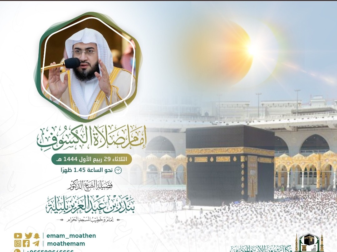 اعلنت الرئاسة العامة لشؤون المسجد الحرام والمسجد النبوي ، وعبر وكالة شؤون الأئمة والمؤذنين ، ممثلة في إدارة شؤون الأئمة، بان إمام صلاة كسوف الشمس ، يوم غدا الثلاثاء 29 ربيع الأول 1444هـ -بمشيئة الله – بالمسجد الحرام ، الدكتور بندر عبدالعزيز بليلة، فيما سيكون وقت الصلاة: 1.45 ظهرًا.