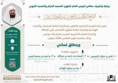 برعاية الرئيس العام لشؤون المسجد الحرام و المسجد النبوي الدكتور عبدالرحمن بن عبد العزيز السديس، تقيم الإدارة العامة للاتصال والتوعية الإعلامية ممثلة في إدارة التوعية الإعلامية بالتعاون مع الإدارة العامة للدراسات والأبحاث الهندسية والإدارة العامة لشؤون الأشخاص ذوي الإعاقة والإدارة العامة لأكاديمية المسجد الحرام لقاء توعوي بعنوان (وينطلق لساني ) وذلك بمناسبة اليوم العالمي للتأتأة.