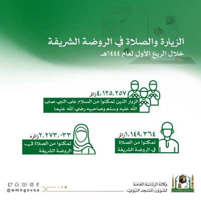 اعلنت الرئاسة العامة لشؤون المسجد الحرام والمسجد النبوي ، وعبر وكالة شؤون المسجد_النبوي ، ان عدد الذين تمكنوا من الزيارة والصلاة في الروضة الشريفة خلال الربع الأول لهذا العام 1444هـ الجاري بلغ 4 ملايين و125 الف و257 زائر وزائرة .