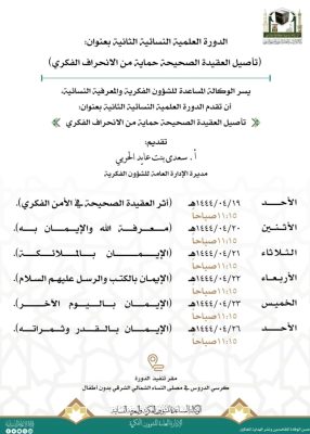 غدا الاحد …‏انطلاق الدورة العلمية الثانية النسائية بعنوان “تأصيل العقيدة الصحيحة حماية من الانحراف الفكري” بالمسجد النبوي.