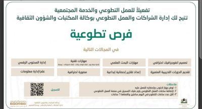 وجهت الرئاسة العامة لشؤون المسجد الحرام والمسجد النبوي، وعبر وكالة المكتبات والشؤون الثقافية النسائية، ممثلة بإدارة الشراكات والعمل التطوعي، الدعوة لجميع فئات المجتمع للتسجيل في الفرص التطوعية المطروحة التي تتيحها الإدارة في الوقت الحالي.
