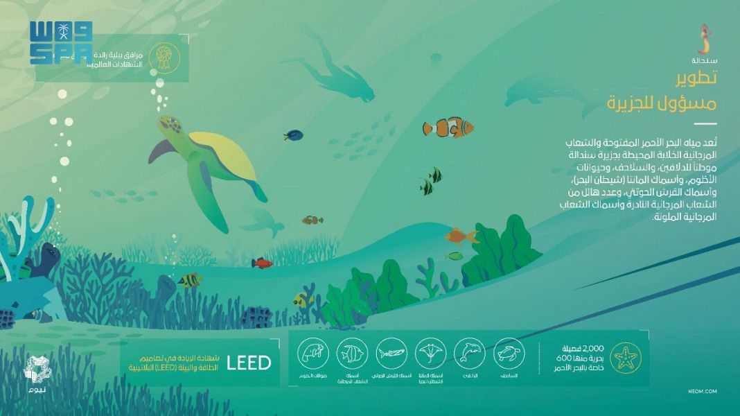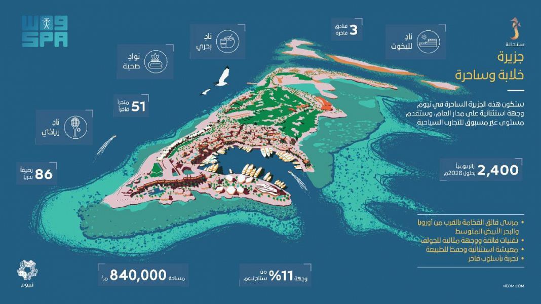 وستعمل نيوم على تحقيق هذه التطلعات بالتعاون مع العلامات التجارية العالمية في قطاعي الترفيه والفنادق لتطوير الجزيرة وجعلها وجهة حصرية وساحرة في البحر الأحمر لمجتمع اليخوت في العالم، محاطة ببيئتها البحرية الخلابة والمتنوعة التي تضم واحدة من أجمل محميات الشعاب المرجانية في العالم.